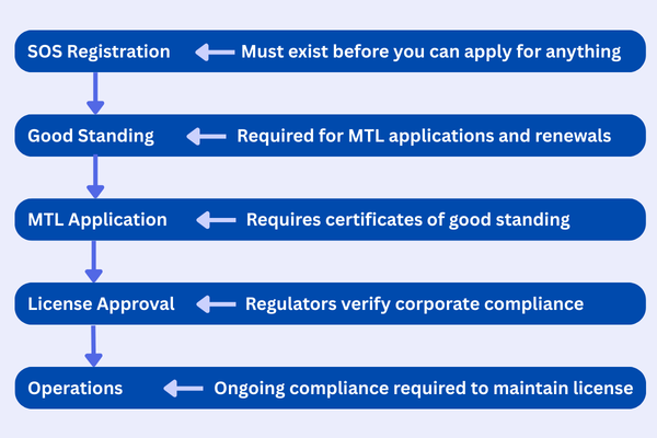 Regulators require proof of entity formation, good standing certificates (valid 30–90 days), and active registered agents before reviewing MTL apps. Without it, you can't legally apply or operate.